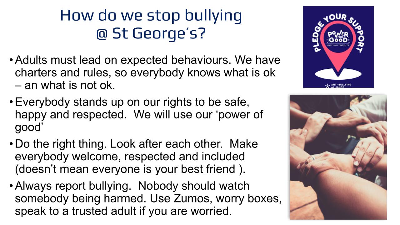 Our school has undertaken a lot of work to design our anti-bullying policy and ethos. Bullying concerns are extremely rare but it is important to everybody at St George's they are dealt with in the interests of children's safety and transparently.
