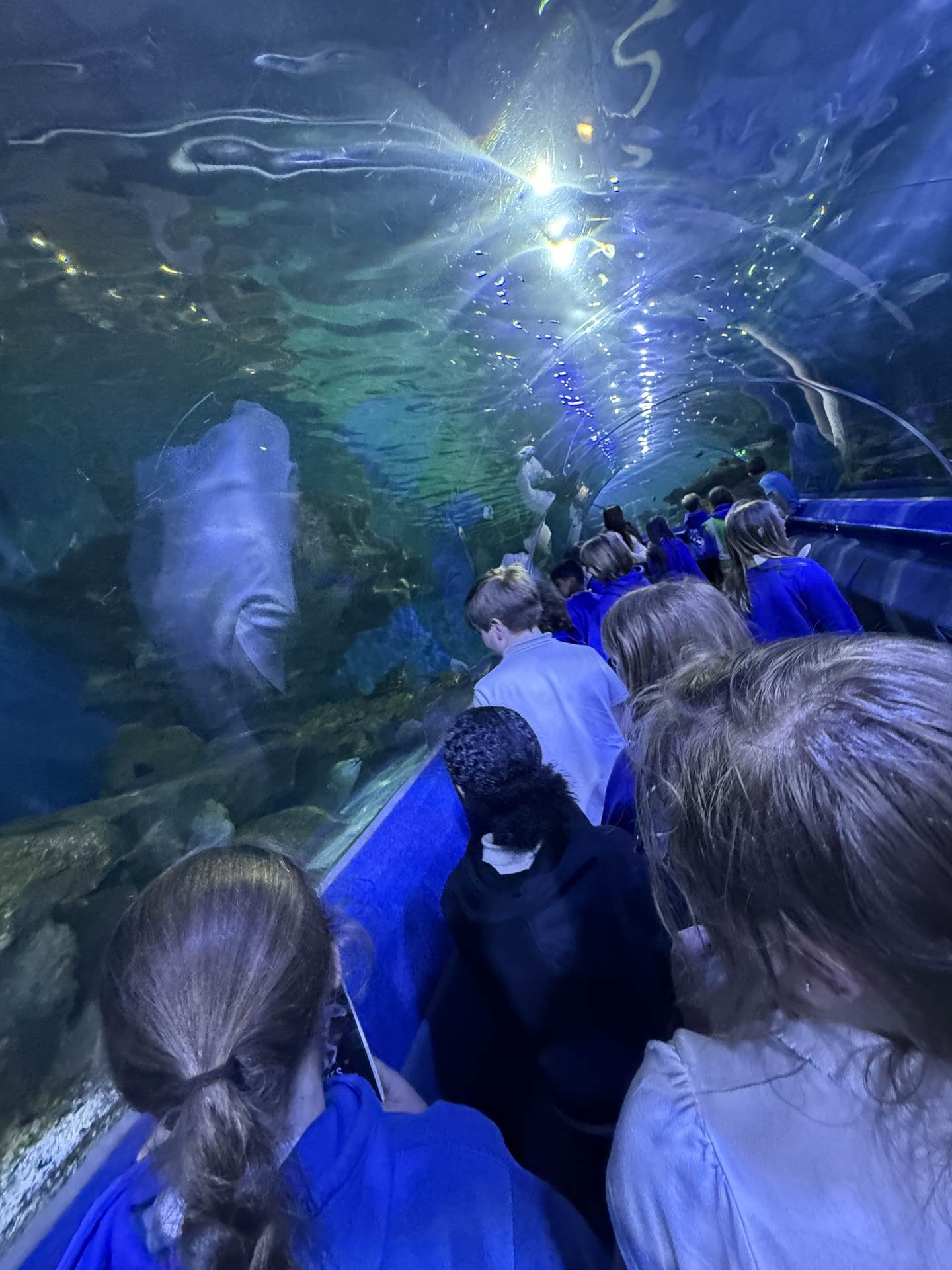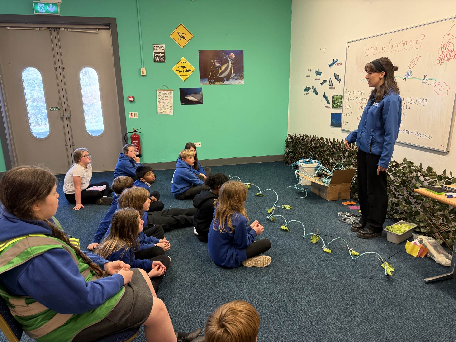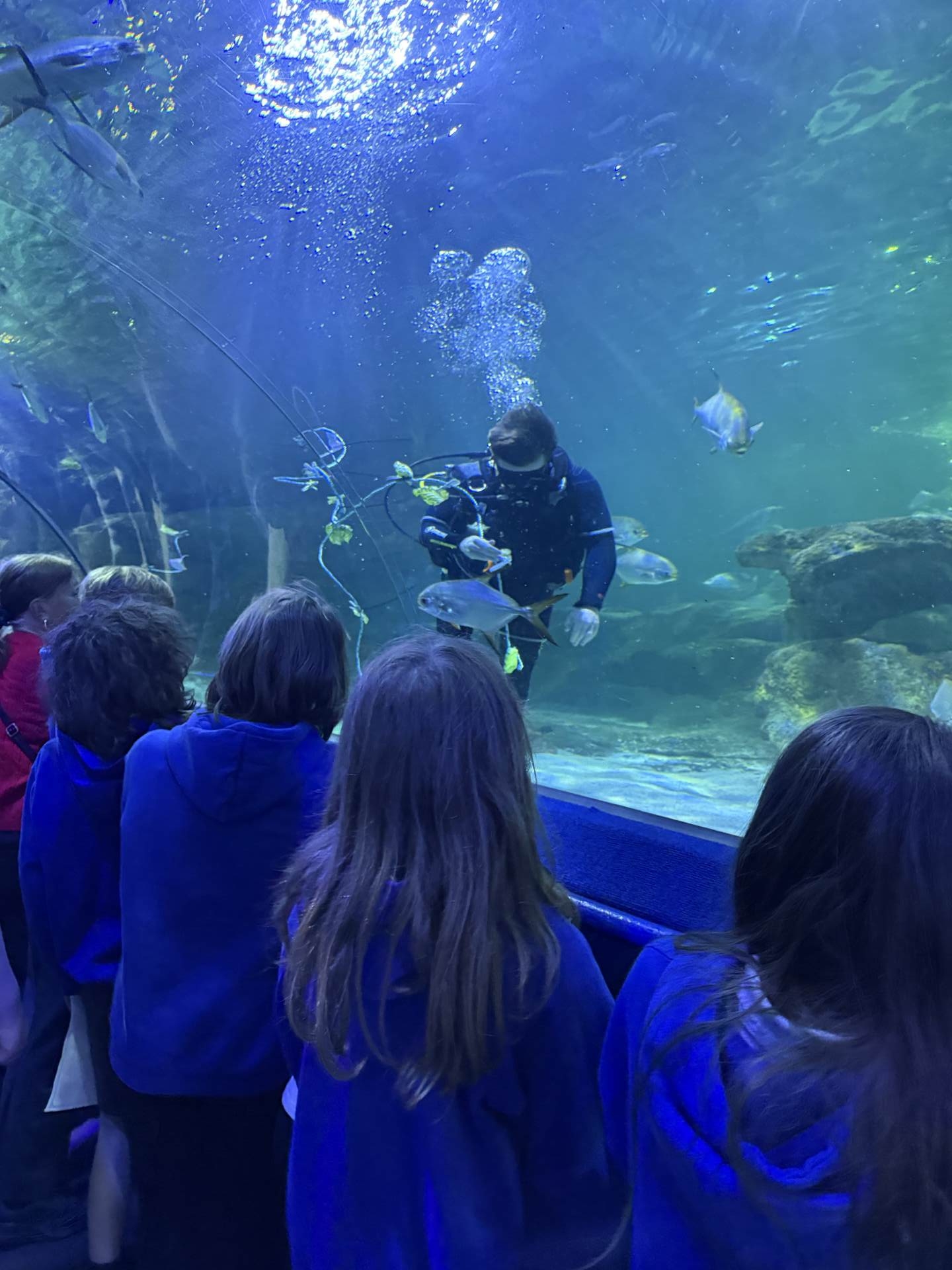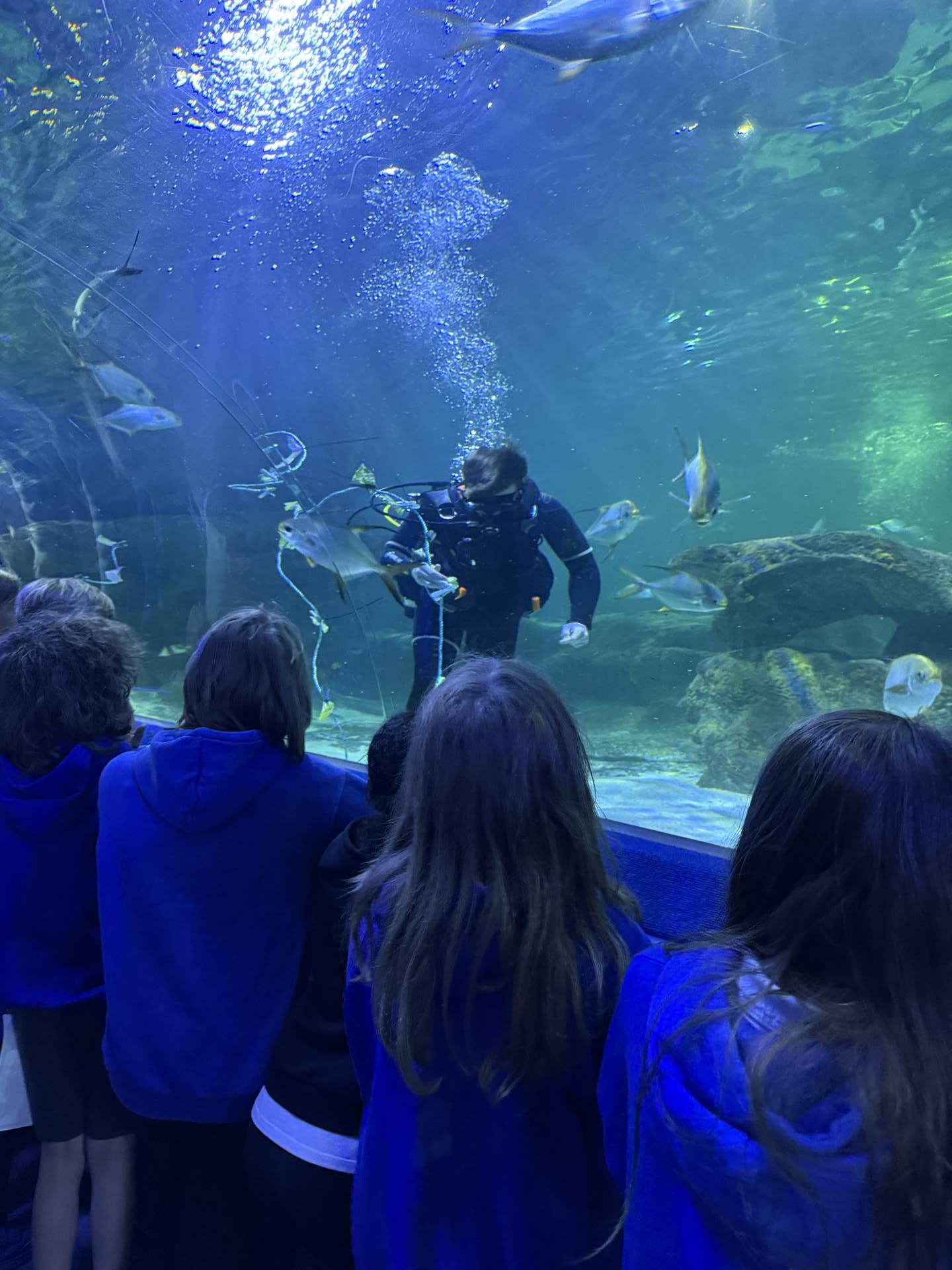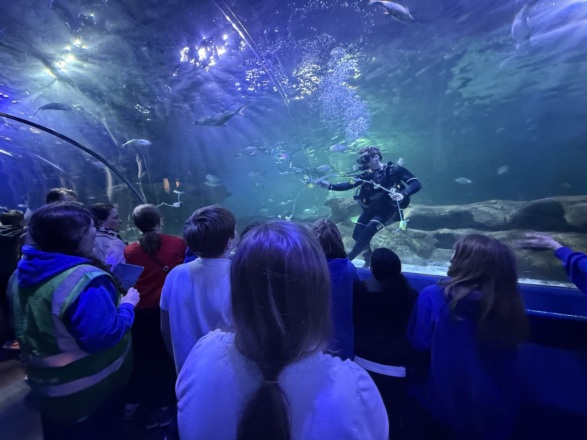 The highlight of the day was a journey through the famous underwater tunnel. As the sharks and rays glided overhead, the students got to see their hard work in action. The divers submerged into the tank, carrying the very enrichment ropes the Eco Team had made earlier that morning!
