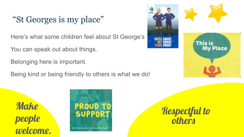 In February 2026 as part of Children's Mental Health Week, children across St George's took part in an exercise to share how we ensure that everybody is welcomed and belongs at St George's. The title was 'this is our place!'