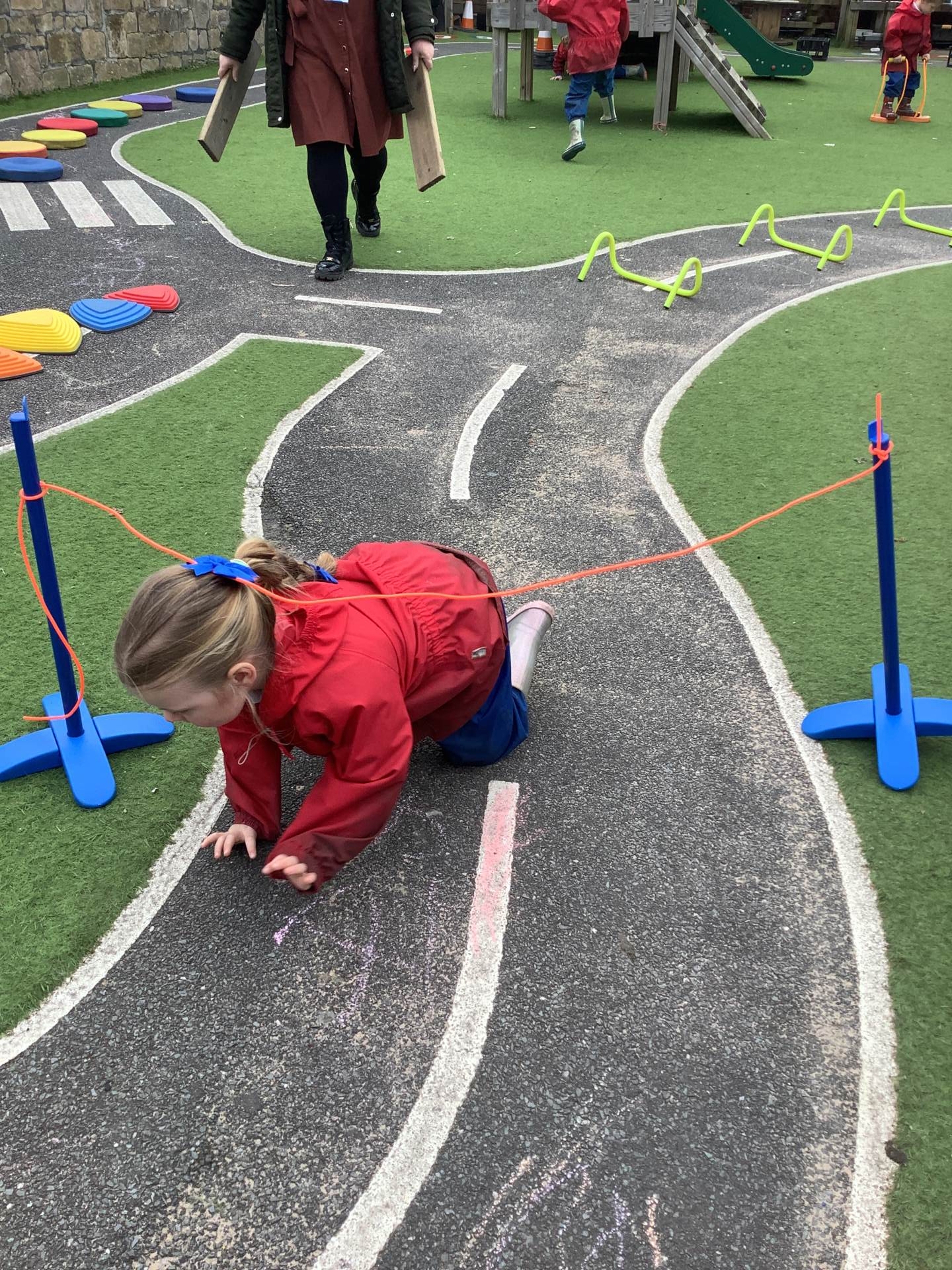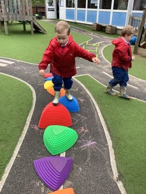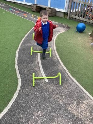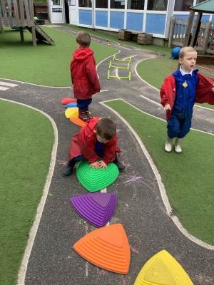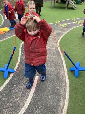 The children have been using their gross motor skills to complete the obstacle course outside, they have been balancing, jumping and climbing under.
