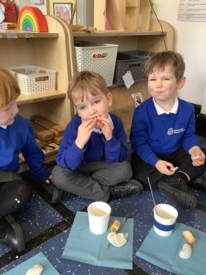 In literacy this week we have been looking at the story of 'The Little Red Hen' as part of our literacy lessons we wrote a shopping list and then our teachers went shopping for the ingredients to make bread. We followed the recipe and worked together to mix the bread dough. The next day we ate it for our snack and we all thought it was delicious.