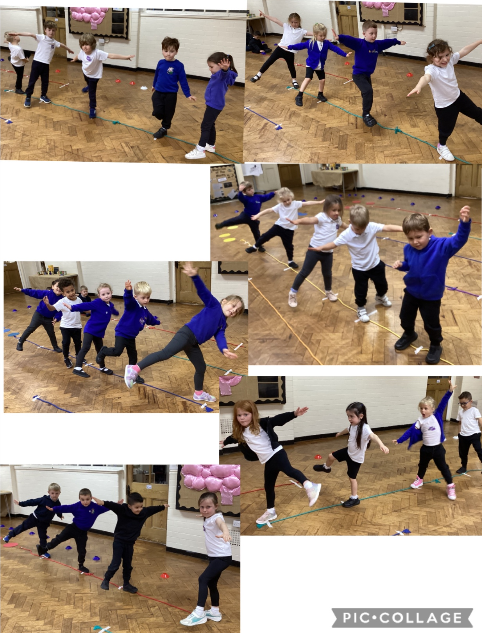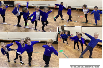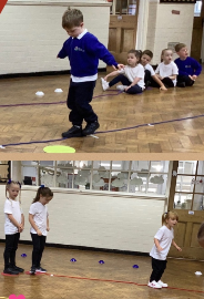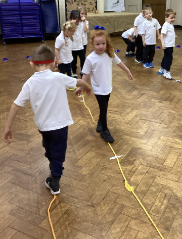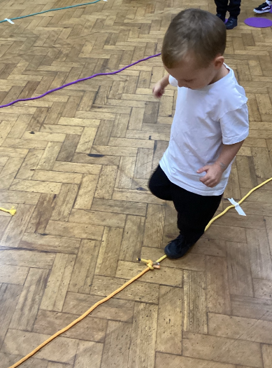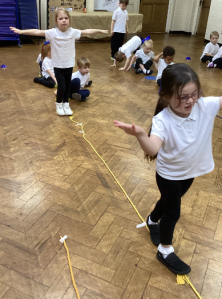 In PE, Reception children practiced balancing on a rope, pretending to be brave tightrope walkers. They showed patience by waiting their turn and going to the back of the line after each try. The children showed resilience as they kept trying even when they wobbled or fell off.