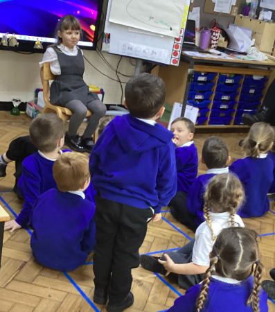 Last week the children were learning about Jack and the Beanstalk and were fully emerged in the book and its characters. At the end of the week they each took turns to pretend to be the giant, and one of their friends asked them a question linked to the story. They were able to ask relevant questions like "How did it feel when Jack took your hen?", "Where did you get the harp from" and "What is your favourite food?"